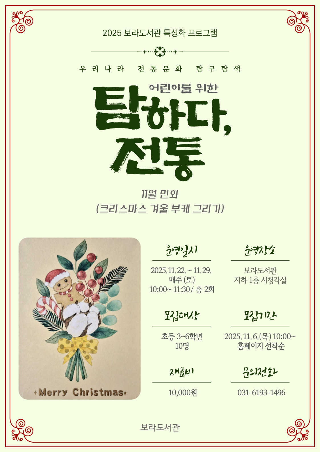 ○ 2025년 보라도서관 특성화 프로그램 <탐하다, 전통> - 10월 민화(초등학생 / 크리스마스 겨울 부케 민화 그리기)