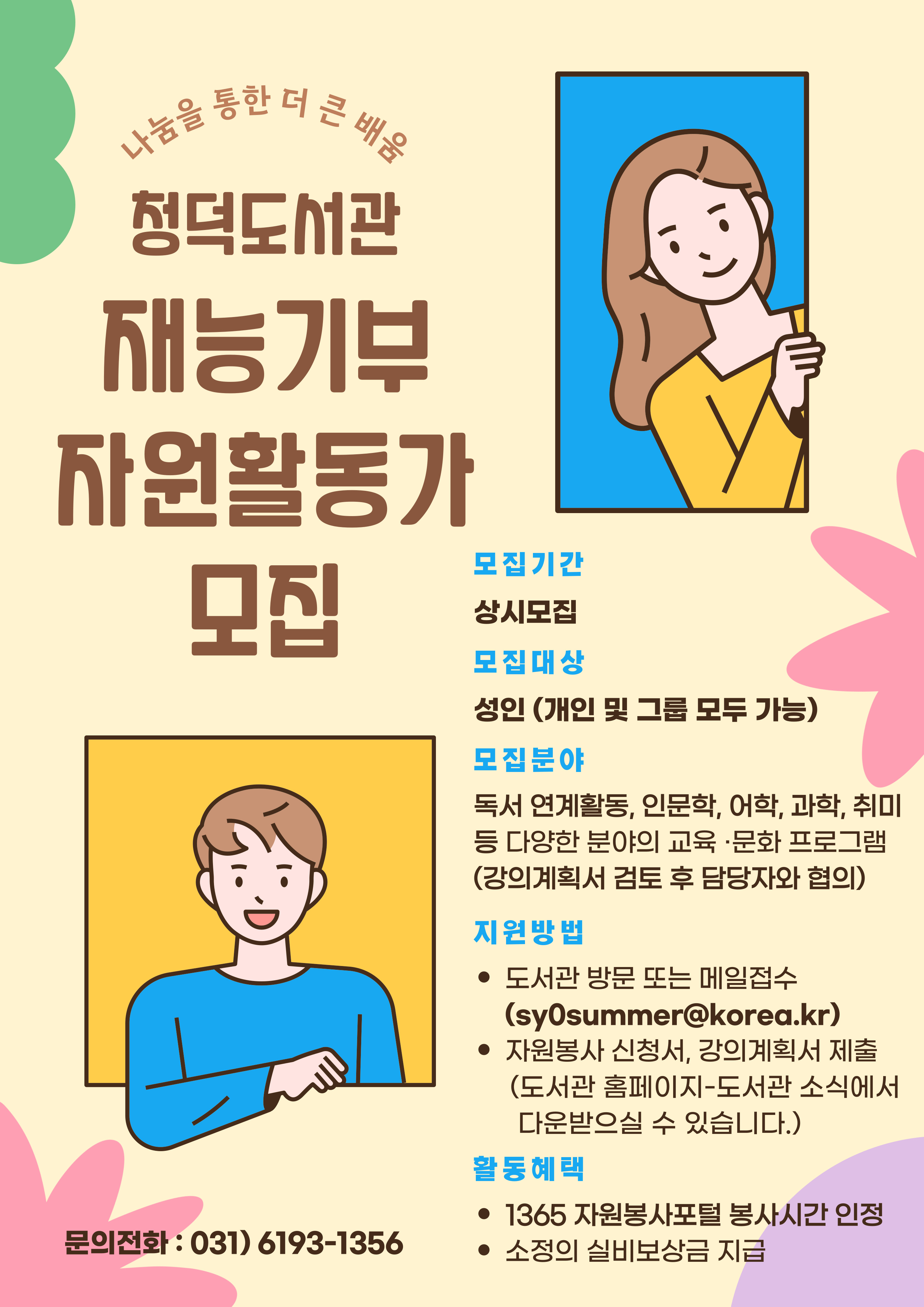 청덕도서관 재능기부 자원활동가 모집안내(상시 모집)