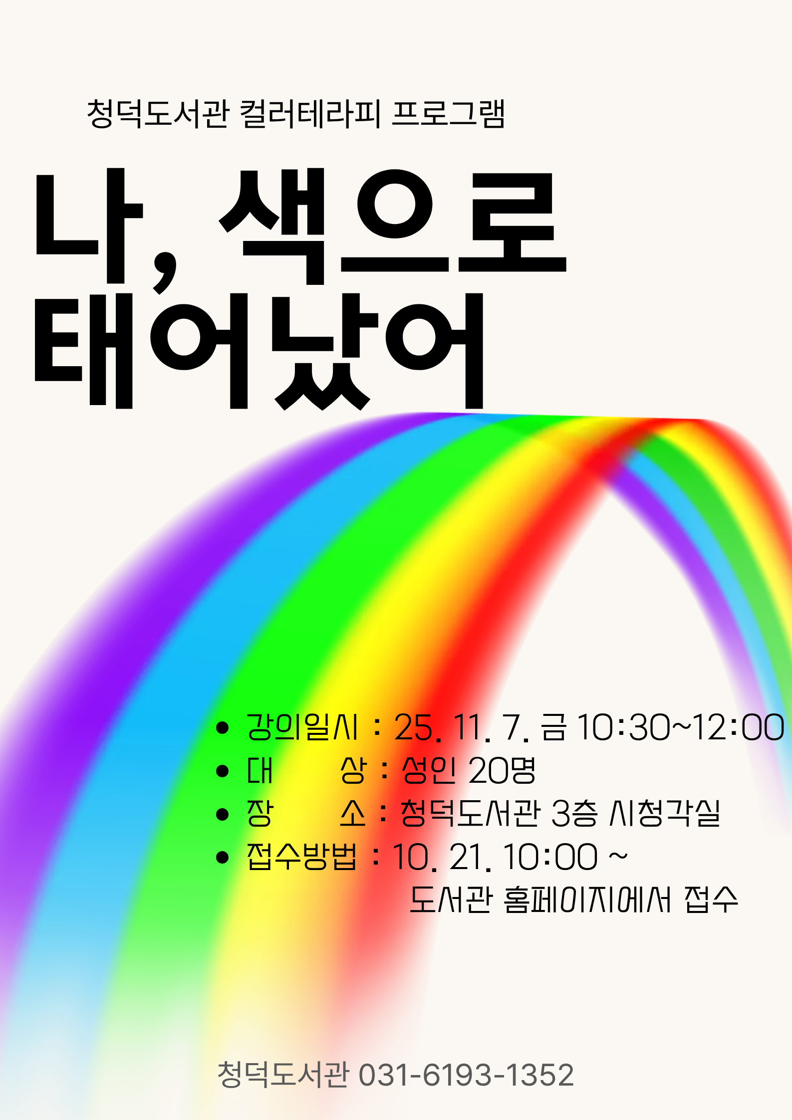 ○ 장 소 : 청덕도서관 3층 시청각실 ○ 접 수 : 2025. 10. 21.(화) 오전 10시 ~ 청덕도서관 홈페이지 선착순 접수