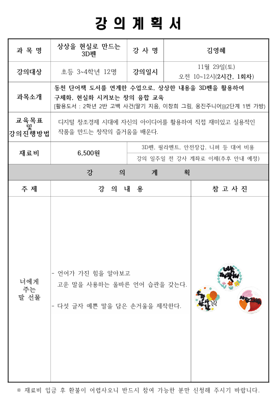 [동천] 동천 단어책 연계 프로그램 상상을 현실로 만드는 3D펜 (*초등 3~4학년 대상 프로그램*)