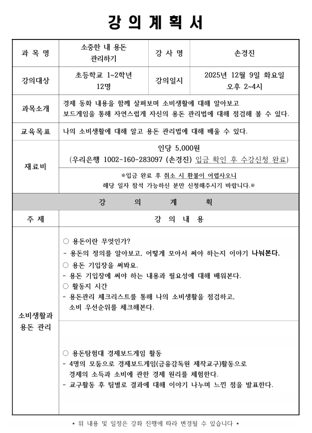 ○ 강의내용 : 경제 동화 내용을 함께 살펴보며 소비생활에 대해 알아보고