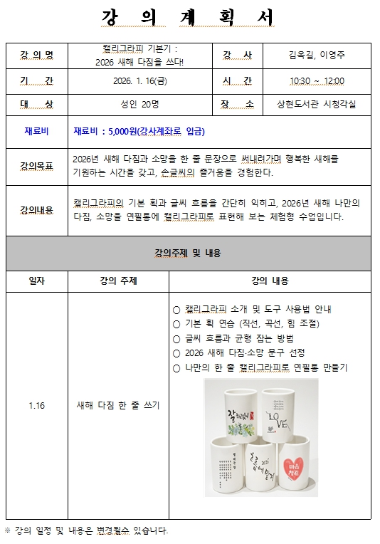 상현 [상현] 재능기부 프로그램 <캘리그라피 기본기 : 2026 새해 다짐을 쓰다!> 신청