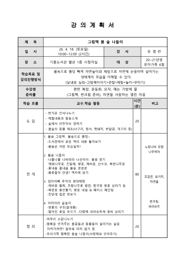 기흥 4월 독서문화 프로그램 「그림책 봄 숲 나들이; 봄 속으로 풍덩!」