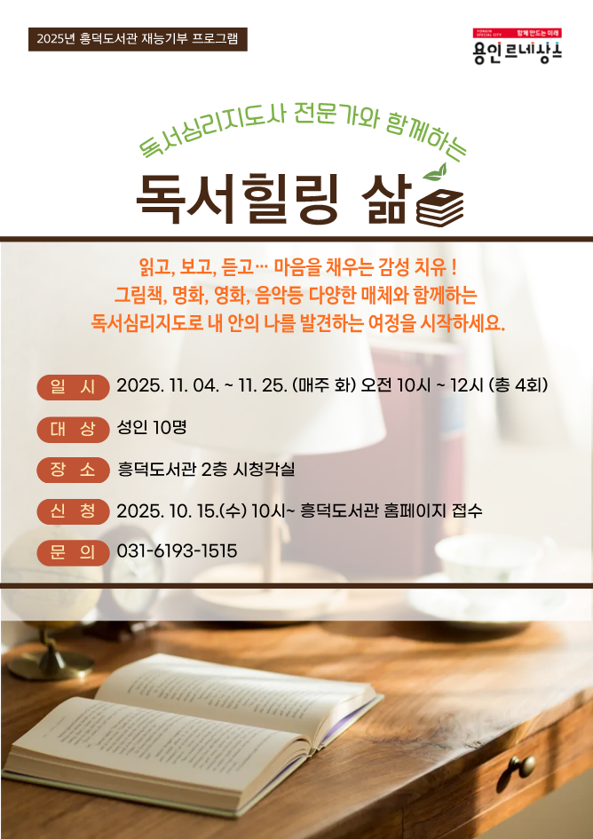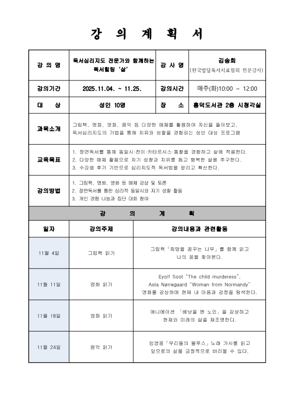 흥덕 [흥덕] 11월 재능기부 프로그램 「독서심리지도 전문가와 함께하는 독서힐링 ‘삶’」