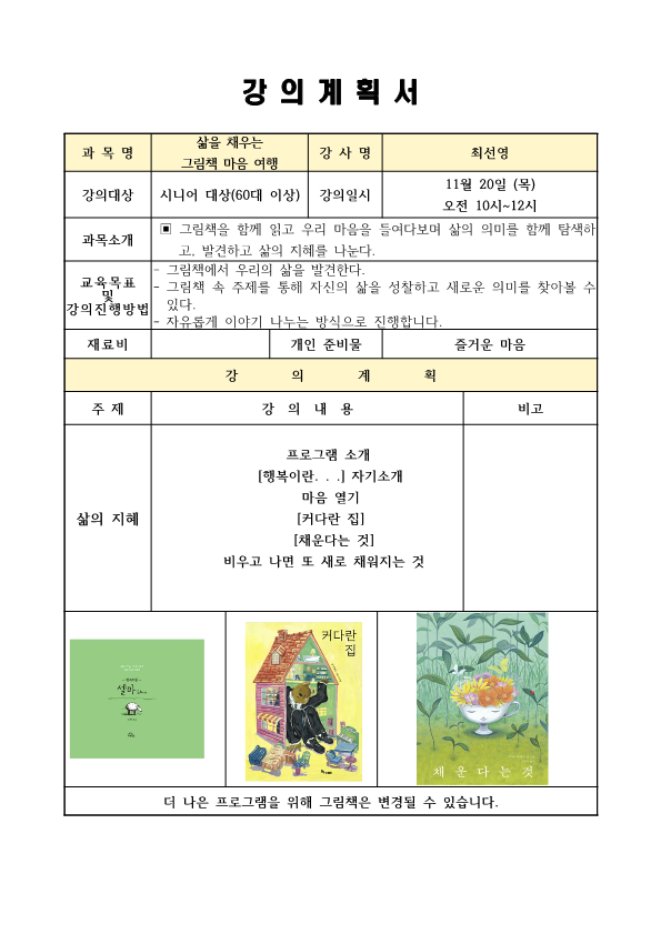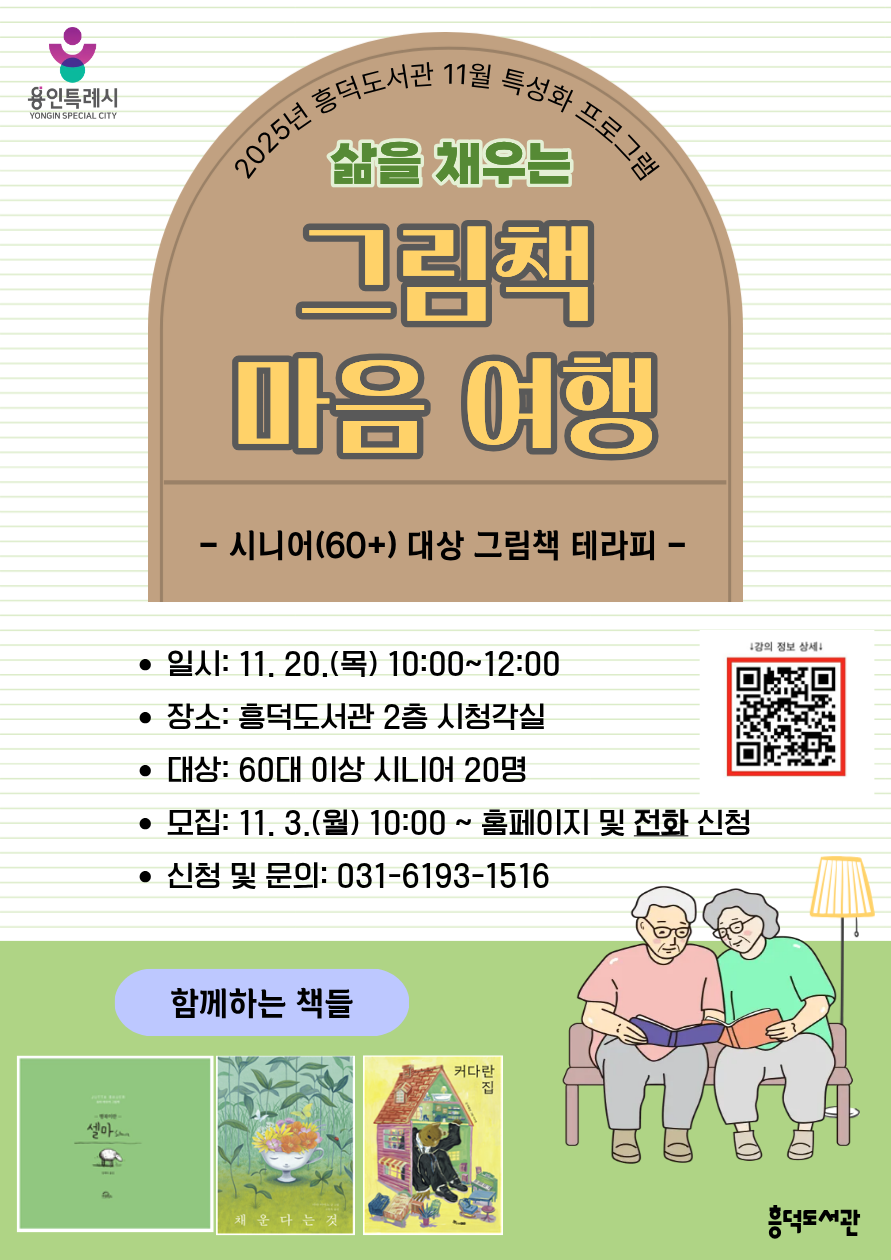 모집기간11. 3.(월) 오전 10시 ~ 도서관 홈페이지 문화행사 선착순 모집대상시니어(60대 이상) 20명(★반드시 참석자 이름으로 신청해주세요★) 강의방식 대면 강의 강의장소 흥덕도서관 2층 시청각실 강의일자11. 20.(목) 오전 10:00~12:00 (2시간, 1회차 강의) 강의내용 그림책을 읽고, 우리 마음을 들여다 보며, 자신의 삶을 성찰하고 새로운 의미를 찾아본다. 강사소개최선영