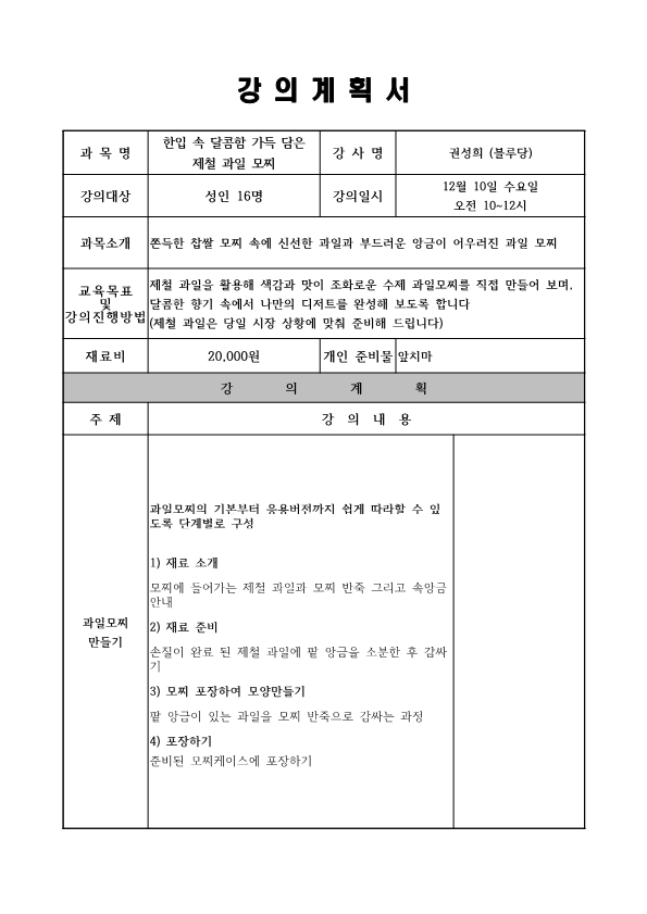 모집기간11. 24.(월) 오전 10시 ~ 도서관 홈페이지 문화행사 선착순 모집대상성인 16명(★반드시 참석자 이름으로 신청해주세요★) 강의방식 대면 강의 재 료 비 20,000원 *추후 입금계좌 안내 예정 준 비 물앞치마 강의일자12. 10.(수) 10:00~12:00 강의내용 쫀득한 나만의 찹쌀 제철과일 모찌 만들기 강사소개 권성희(블루당)