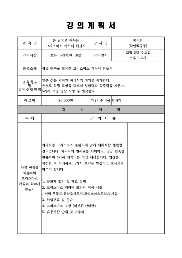 모집기간11. 17.(월) 오전 10시 ~ 도서관 홈페이지 문화행사 선착순 모집대상초등 1~3학년 16명(★반드시 참석자 이름으로 신청해주세요★) 강의방식 대면 강의 재 료 비 20,000원 *추후 입금계좌 안내 예정 준 비 물앞치마 강의일자12. 3.(수) 15:00~17:00 강의내용 크리스마스 캐릭터를 화과자로 만들어 보아요! 강사소개 홍수연(화연떡공방)