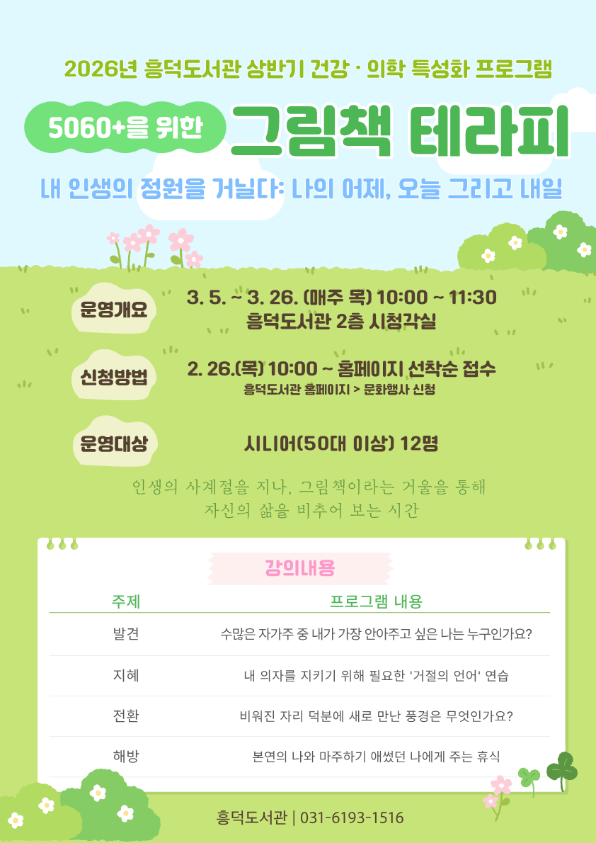 [흥덕_대면] 2026년 상반기 시니어 그림책 테라피 「5060+를 위한 그림책 테라피」(3/5~3/26, 매주 목요일 10~12시, 총 4회)