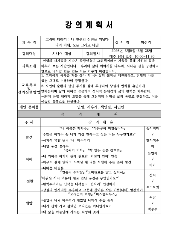강의 내용 인생의 사계절을 지나, 그림책이라는 거울을 통해 자신의 삶을 비추어 보는 그림책 테라피 시간 강사 소개 최선영(그림책 통합 활동가)