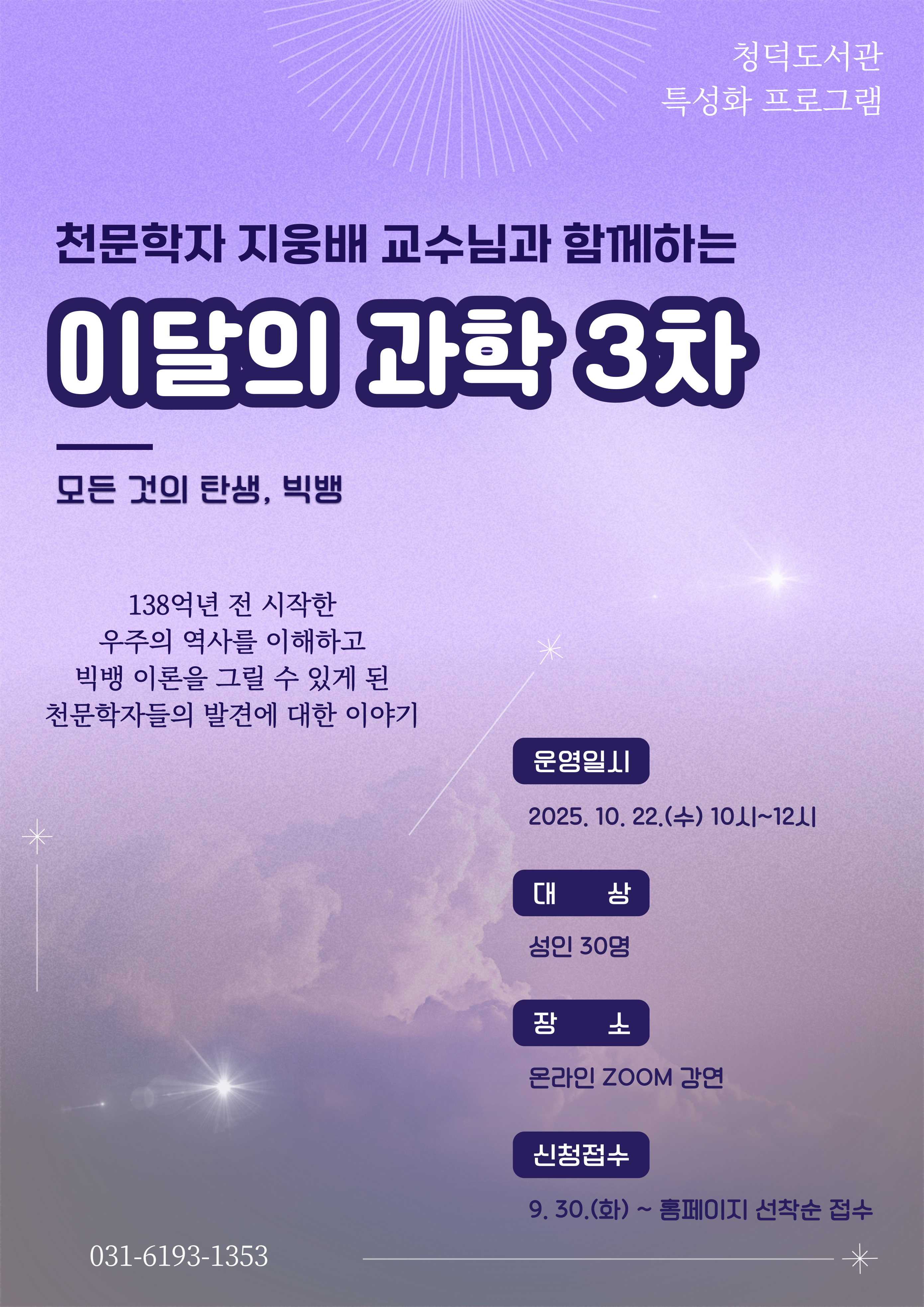 10월 청덕도서관 교양과학 특성화 프로그램 <천문학자 지웅배 교수님과 함께하는 이달의 과학 > 3회차 모집 안내