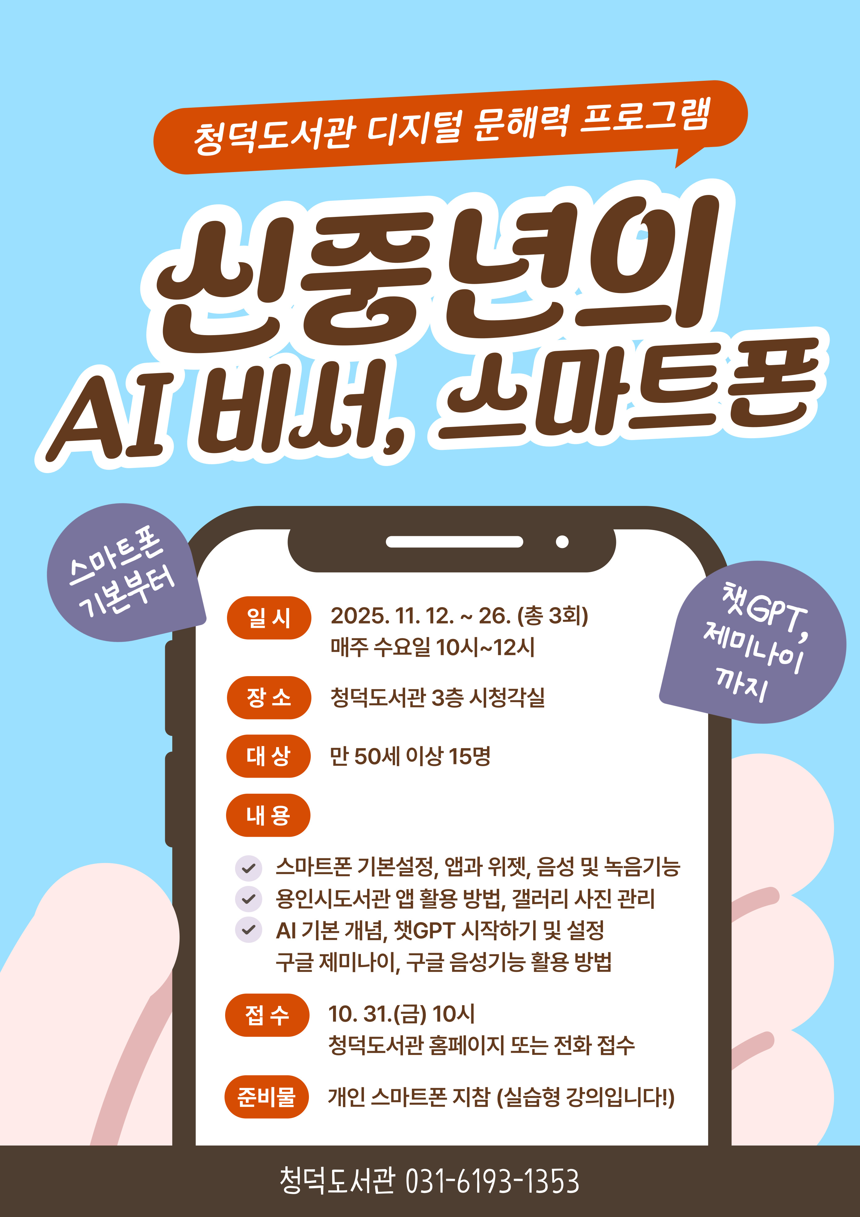 청덕 [대면] 신중년의 AI 비서, 스마트폰 <만 50세 이상> 11.12.~26.(매주 수, 총 3회) 오전10-12시