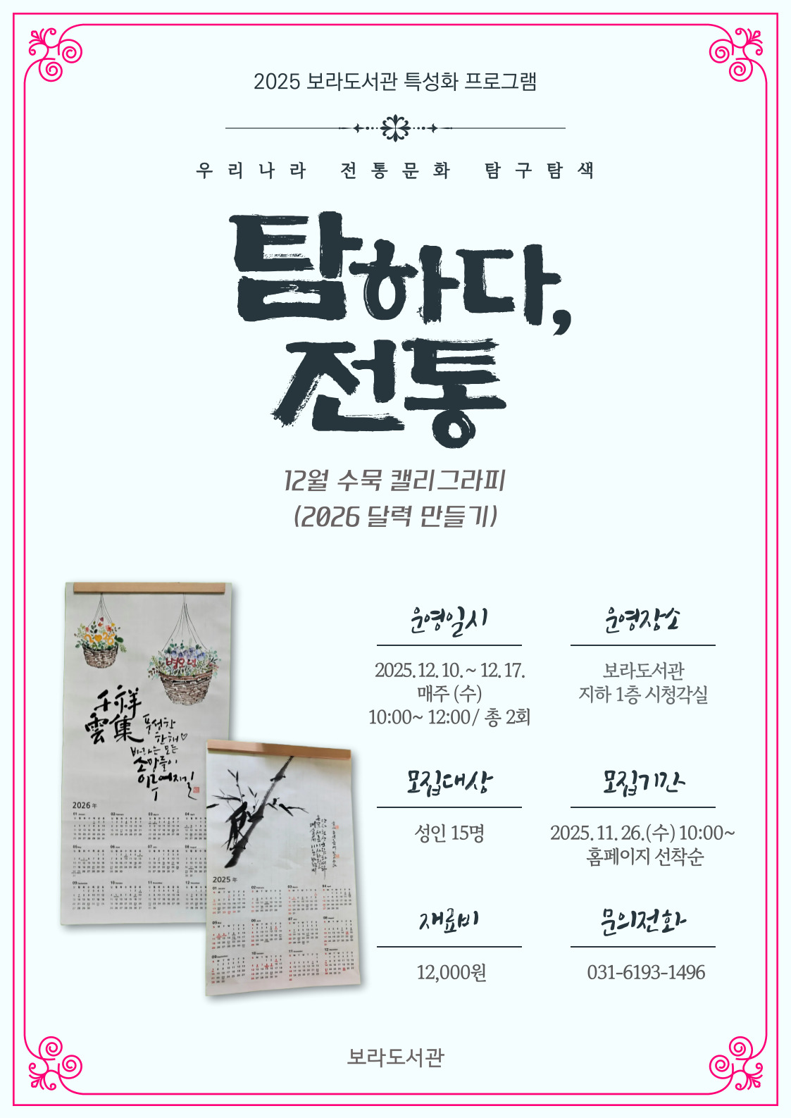 ○ 2025년 보라도서관 특성화 프로그램 <탐하다, 전통> - 12월 수묵 캘리그라피(성인)