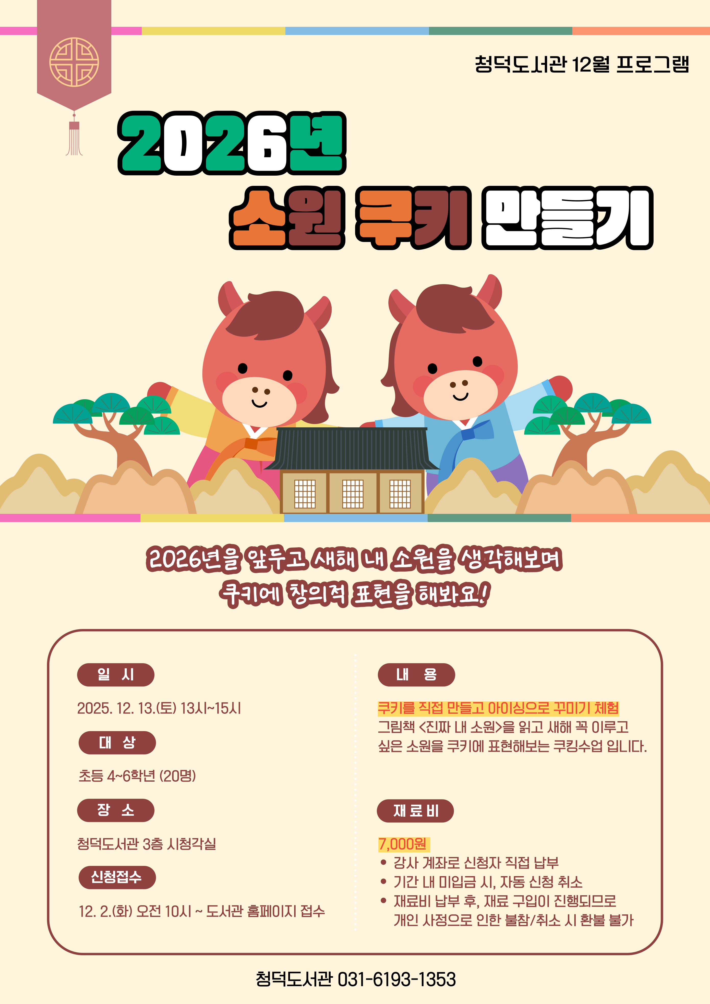 청덕도서관 12월 동화쿠킹 프로그램 초등 4~6학년「2026년 소원 쿠키 만들기」운영 안내