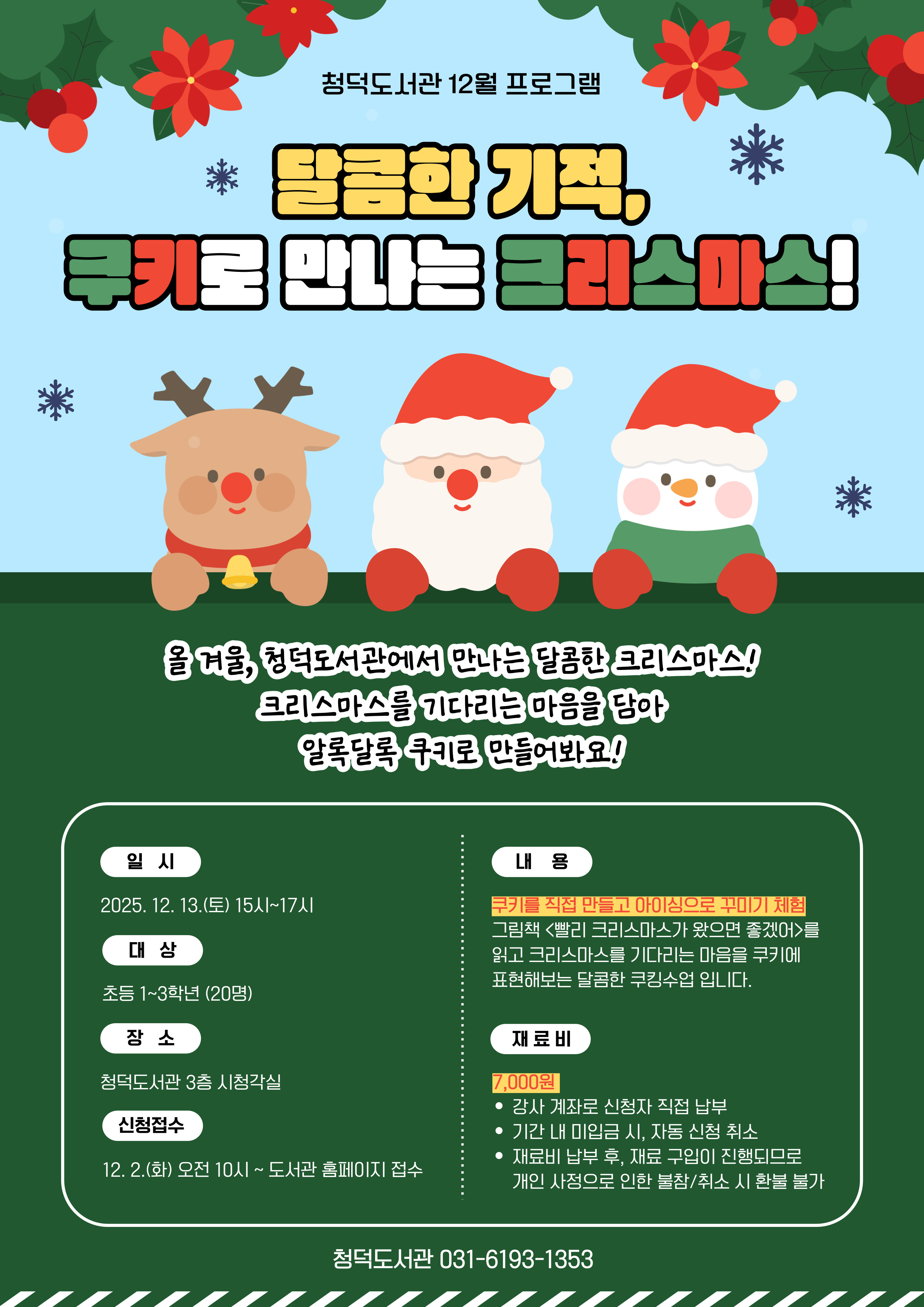 청덕도서관 12월 동화쿠킹 프로그램 초등 1~3학년「달콤한 기적, 쿠키로 만나는 크리스마스」운영 안내