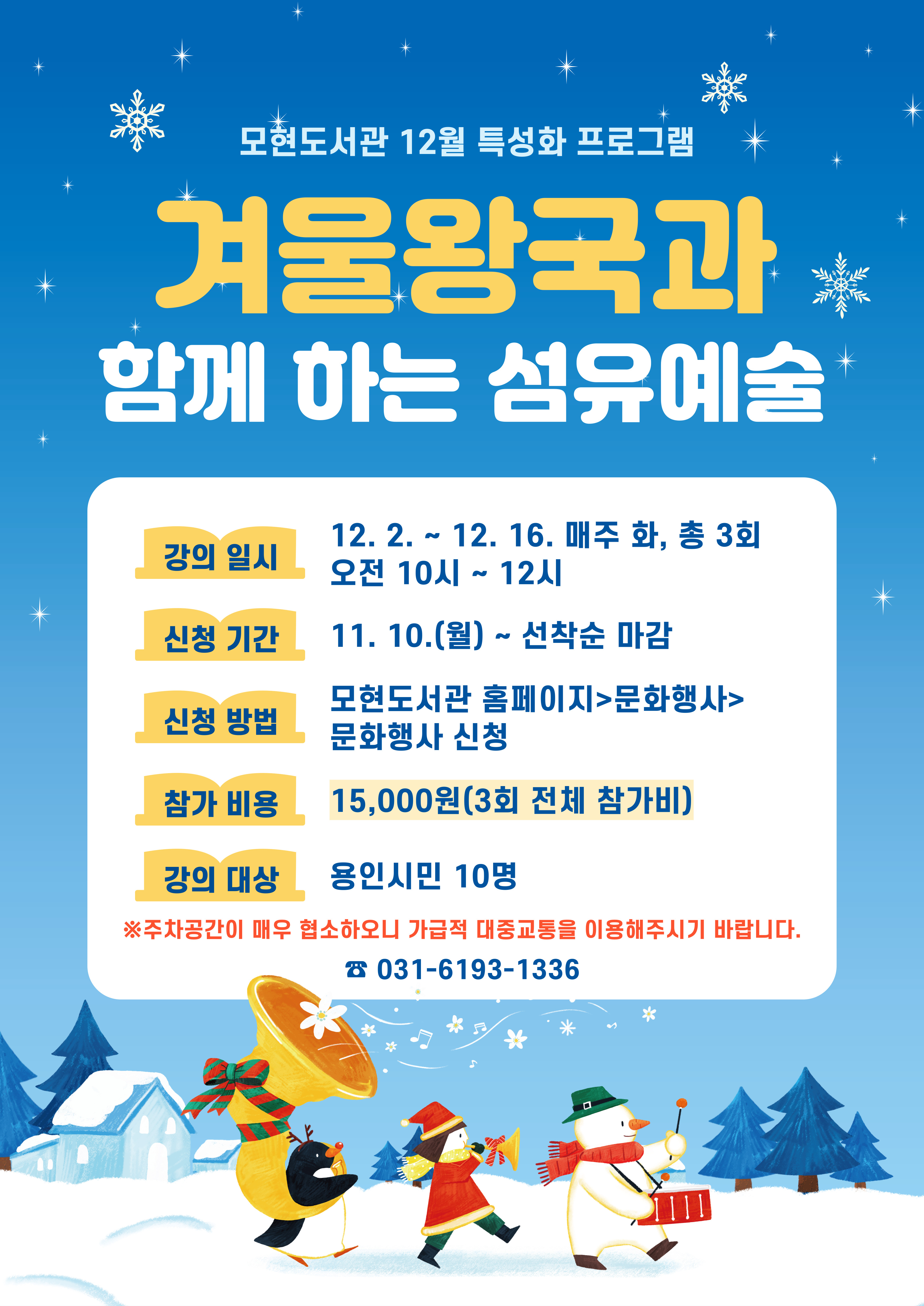 - 자세한 수업내용은 첨부파일의 강의계획서를 참고해주세요. ※재료비: 15,000원(3회 전체 재료비) ※주차 공간이 매우 협소하오니 가급적 대중교통을 이용해주시기 바랍니다.