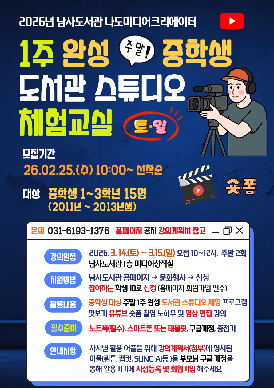 [남사] 중학생 <주말 1주 토,일 완성> 도서관 스튜디오 체험교실 모집안내