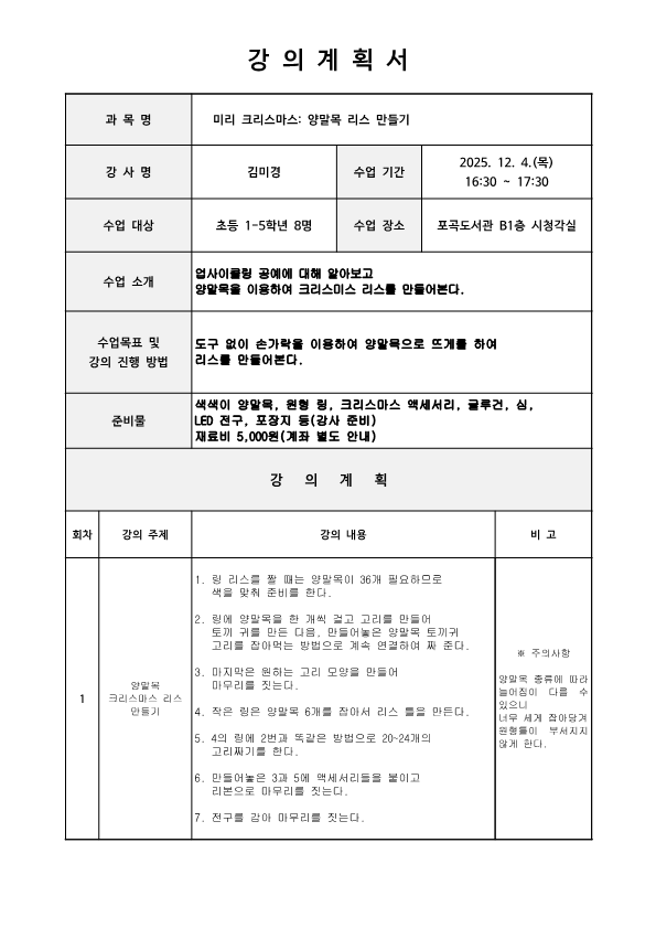 [포곡] 12월 프로그램 모집 안내 <미리 크리스마스 - 양말목 리스 만들기(초등)> <그림책으로 Bye 2025! Hi 2026!(성인)>