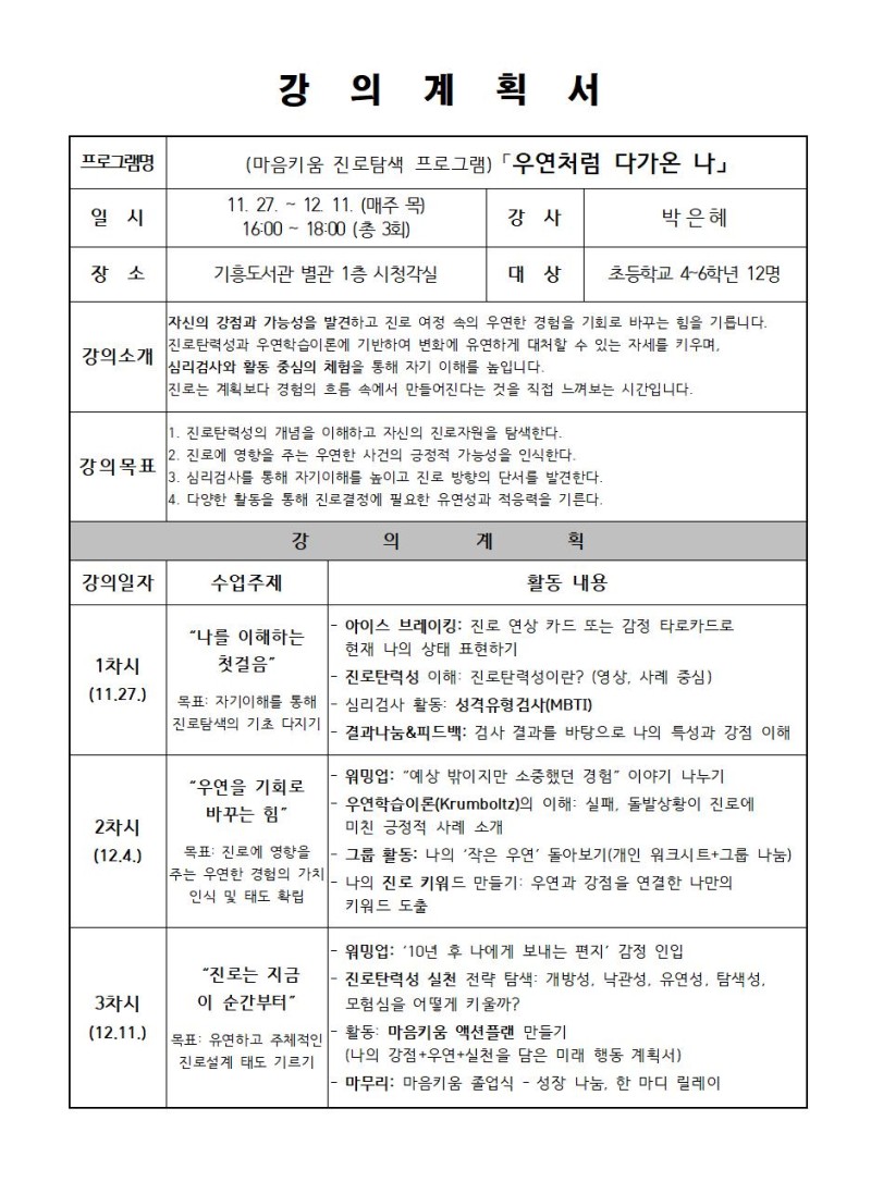 기흥 [기흥] 11월 특성화 프로그램 「마음키움 진로상담 : 우연처럼 다가온 나 」