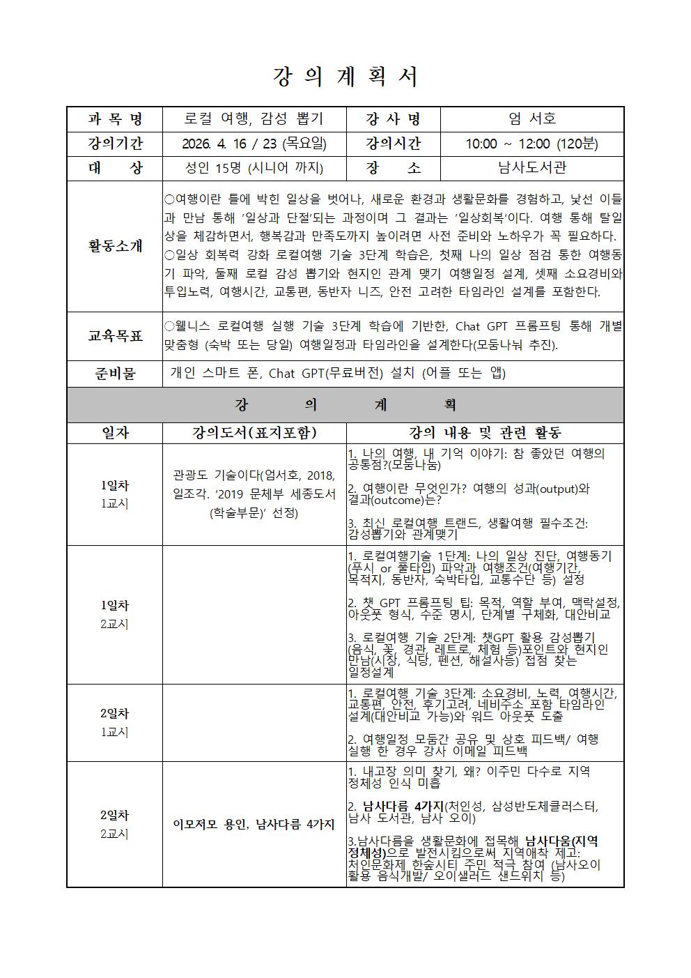 남사 [남사] 경기대 엄서호 명예교수와 함께하는 「로컬 여행, 감성 뽑기」 성인~시니어 신청