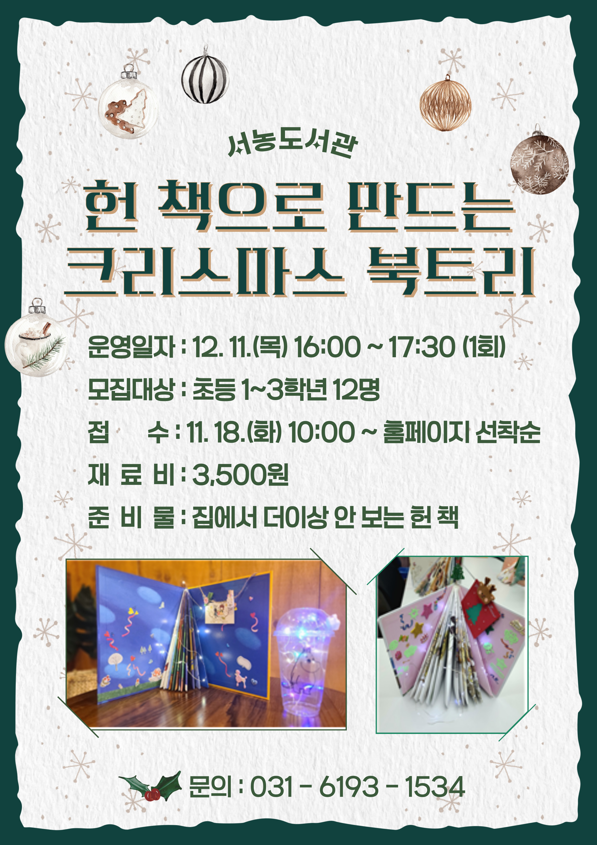 서농도서관 12월 특성화 프로그램「초등 환경공예 : 헌 책으로 만드는 크리스마스 북트리」 운영 안내
