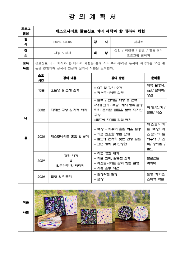 서농도서관 3월 특성화 프로그램「생태미술교실 1기 : 팔로산토 향 오브제 만들기」 운영 안내