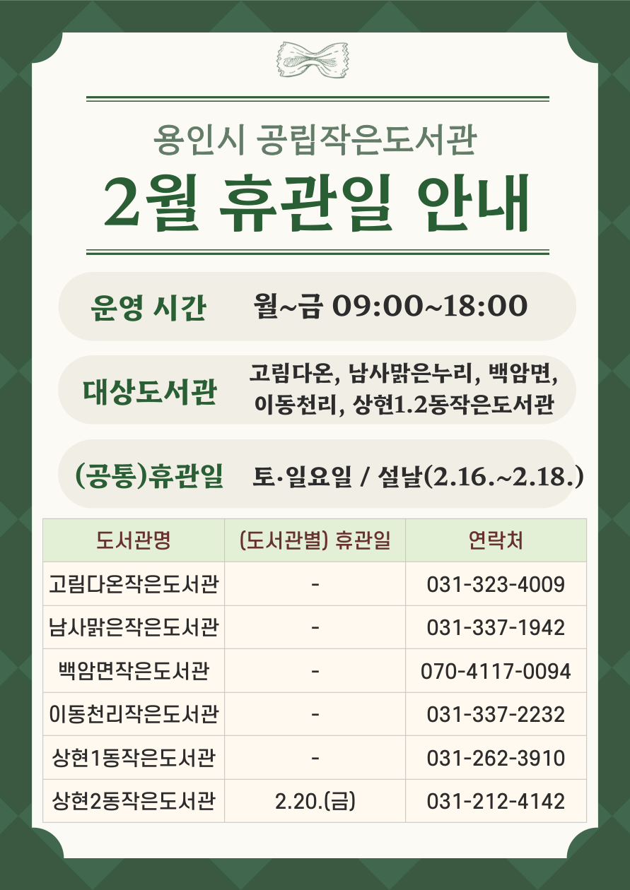 2026년 2월 공립작은도서관 휴관일 안내입니다. 이용에 참고해주세요.