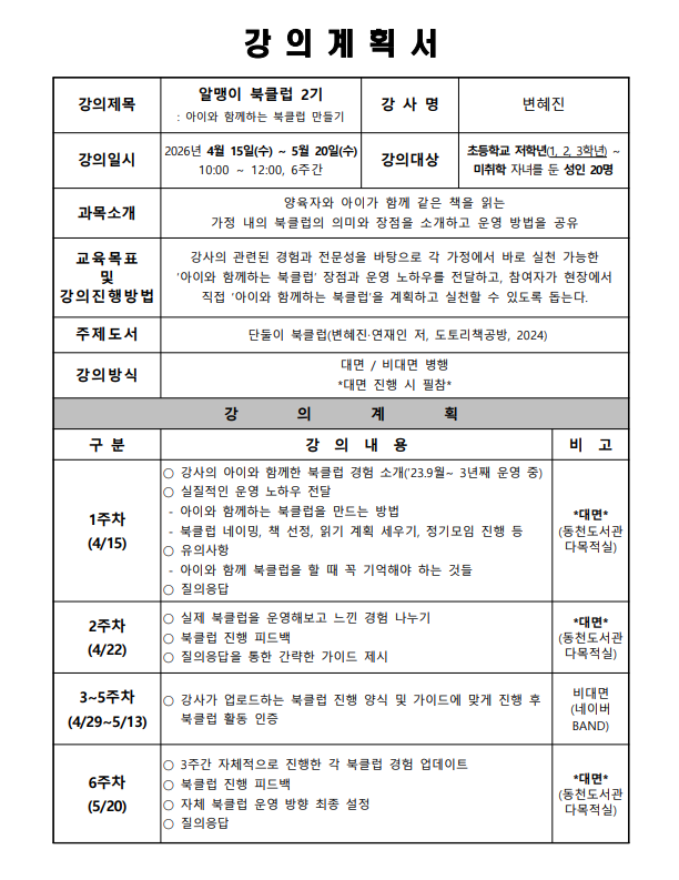 * 대면(동천도서관 다목적실) 수요일 오전 10~12시 → 1, 2, 6주차(4/15, 4/22, 5/20)