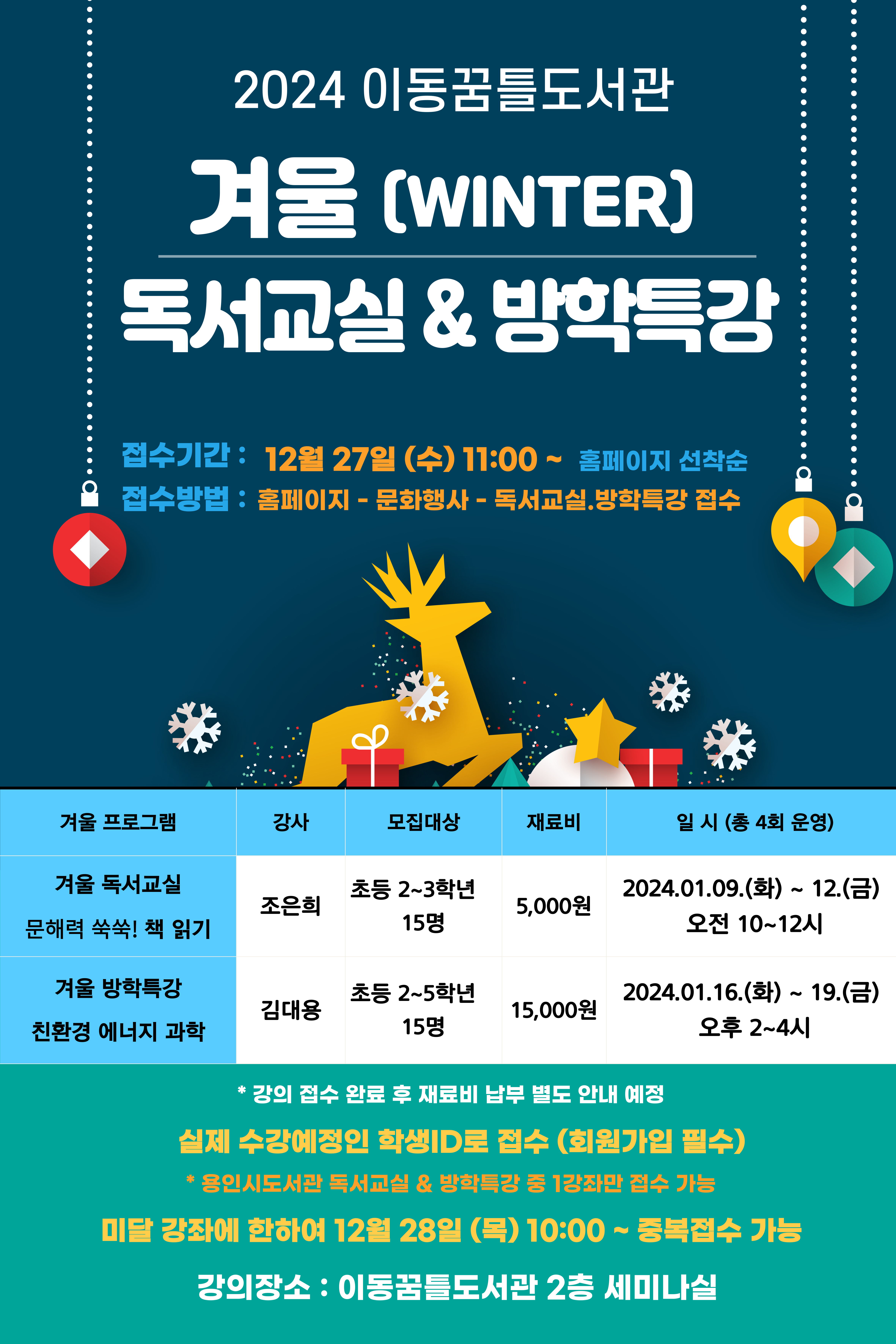 1. 용인시 도서관 1인 1강좌 신청 원칙(강좌 인원 미달시 12.28.(목)부터 중복신청가능)